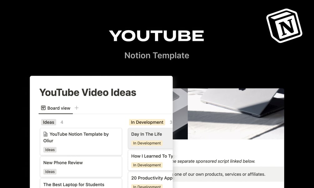 The Notion template I've been using in Notion to completely manage my YouTube channel. It's super lean and designed for anyone and everyone to understand. It has a board for organising your videos and a template for outlining videos.